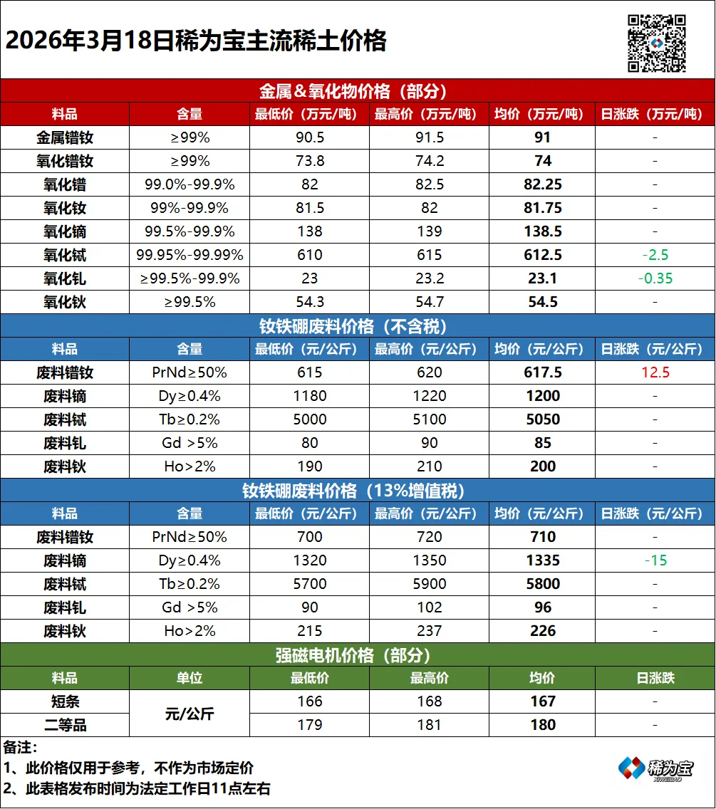 >【稀土行情】2026年3月18日稀土价格汇总(仅供参考)