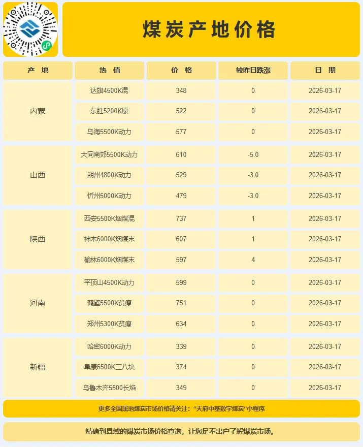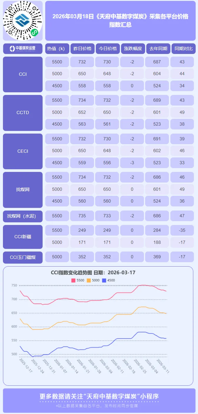 2026年3月17日,国内动力煤市场延续 “高库存压制下的惯性阴跌” 格局。CCI指数显示,5500大卡和5000大卡动力煤价格分别下跌2元/吨,报收730元/吨和648元/吨;4500大卡价格持稳于558元/吨。价格连续多日小幅下探,清晰地表明在当前季节性淡季,“供强需弱”的基本面现实已完全主导市场定价逻辑,价格正通过温和回调来寻求与高库存环境下的新平衡点。