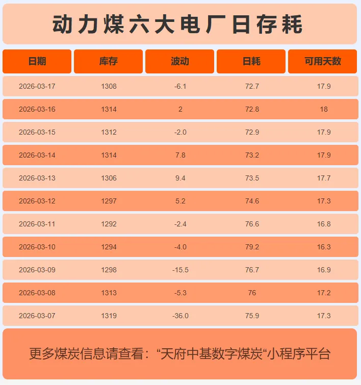 截至3月17日,沿海六大电厂日耗72.7吨,库存1308万吨,存煤可用天数约17.969天。