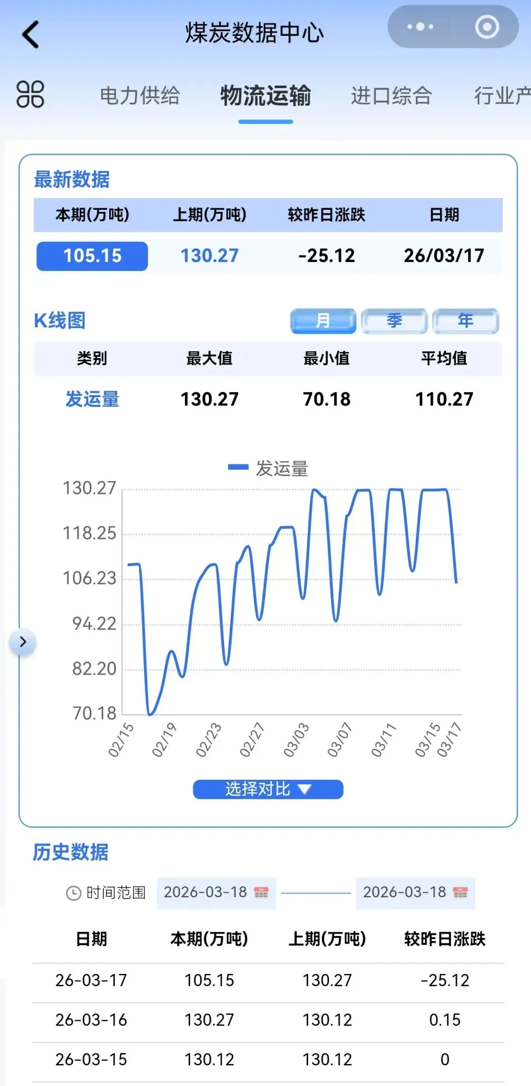 截至3月17日,大秦线日发运量为105.15万吨,较昨日下降25.12万吨。