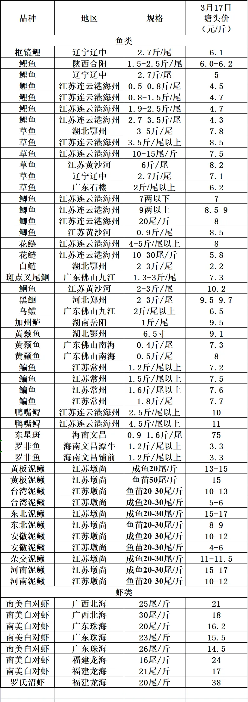 >2026年3月17日各地区水产品行情