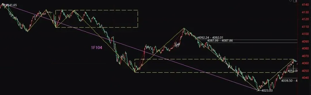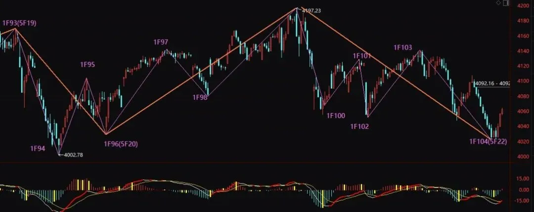 30分钟图上,今天低走延续1F104后反弹,尚不能确认1F104的完结;DIF/DEA在0轴下,绿柱子面积有所缩小但DIF值新低,反弹后还要探底;5F22移至今天的新低点4023.03。