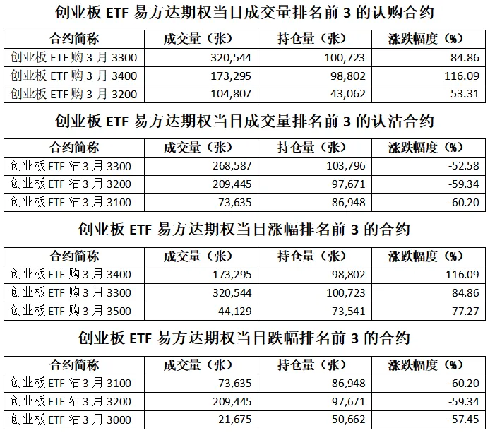 创业板ETF易方达期权总成交面额601.70亿元,减少2.76%,期现成交比为0.29,权利金成交额8.90亿元;期权总成交量1,872,237张,减少3.28%,其中认购期权成交量859,782张,认沽期权成交量1,012,455张,认沽认购成交比率为1.18(上一交易日认沽认购成交比率为1.26)。