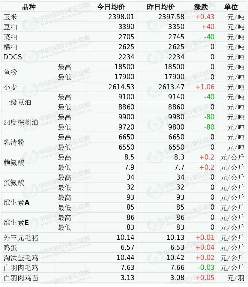 18日DDGS价格坚挺。近期养殖利润欠佳,饲企消化前期库存,采购保持观望心态,原粮玉米价格仍处于高位运行,部分酒精企业生产压力仍存,支撑短期DDGS价格。3月份,我国玉米深加工企业节后将陆续复产,但随着主产品销售淡季来临开机率相比春节前将适度下降,DDGS新增产供量适度下降的几率逐步提高。因原油期货走强叠加美国的生物燃料掺混政策即将落实带动芝加哥豆油大涨,提振了大豆市场人气,CBOT大豆期货收盘上涨,基准期约收高0.1%。目前偏慢的巴西大豆收割进度且海关检验新规令大豆出口较为缓慢,国内大豆到港数量下降,加之通关大豆数量较少后油厂库存下降,在养殖端刚性需求消耗下豆粕库存下降,增强了油厂对豆粕的挺价意愿,但在生猪等养殖亏损及需求逐渐清淡的情况下豆粕或维持震荡调整行情。今日棉粕市场价格稳定为主。菜粕现货方面,全国来看,整体油厂大豆库存回落,国内油厂陆续开机,豆粕库存回落。下游不断消耗前期合同,油厂压车提货放缓,贸易商被动去库过程中挺价。同时棉粕产出恢复慢,供应端压力不大。不过需求端一般,限制棉粕上涨。预计棉粕价格震荡调整。今日郑州菜粕期货低开后震荡下跌。加拿大油菜籽期货收盘大幅上涨,基准期约收高3.8%,收复了周一的大部分失地,追随外部市场的涨势。菜粕现货小幅下跌,华南地区逐渐接近水产备货季节,今年水产投苗较早,有望提前启动需求;另外豆菜粕价差拉大后菜粕重回性价比。但供应端存在恢复预期,远期压力依旧。外盘方面,秘鲁鱼粉厂商保持挺价意愿,由于低配额预期提振,秘鲁新季超级蒸汽鱼粉预售参考价格为CNF2500美元/吨,涨50美元/吨,当前预售成交在6万吨,近日成交一般。国内进口鱼粉市场,局部货源紧张以及终端提货支撑,鱼粉继续上调。当前秘鲁超级蒸汽鱼粉价格集中在17900-18500元,短期鱼粉持货商保持观望挺价。今日小麦市场价格稳中偏强运行。当前供应端政策性粮源持续加码,中储粮及地方储备轮出同步发力,短期或对价格过快上涨形成抑制,但难以改变市场整体偏紧格局。需求端支撑依然较强:一是面粉企业库存偏低,补库动力仍在;二是玉米价格高位运行,小麦饲用替代逐步增加 。加上冬小麦播期推迟、弱苗偏多及倒春寒风险,市场对新季产量的担忧情绪仍在发酵 。综合来看,短期流通粮源偏紧,市场看涨情绪较强,小麦价格维持偏强运行。昨日油脂期货价格震荡,受原油上涨、地缘冲突及生物燃料政策预期推动,市场短期偏强但基本面需求疲软。能源属性强化带动棕榈油、豆油与原油联动走高,中东局势紧张提升生物柴油经济性,支撑油脂价格。但高库存与节后消费淡季致下游采购谨慎。整体油脂震荡运行。受战争影响,运价上涨运力紧张,下游担忧到货延迟,购销好转,乳清粉市场稳中偏强整理,后续需注意到货量进展以及港口库存量等因素。2025年12月,我国赖氨酸与赖氨酸盐及酯的出口量为9.8万吨,同比增0.4%,环比增8.4%。3月3日起星湖伊品氨基酸产品上调200-300元/吨。3月5日大成生化氨基酸产品上调100-500元/吨。3月6日金玉锋98%赖氨酸报价6.65元/公斤,70%赖氨酸报价4.65元/公斤。3月9日星湖伊品大品种氨基酸上调200-1000元/吨。3月16日星湖伊品大品种氨基酸上调300-1000元/吨。2025年12月国内蛋氨酸进口量为2.1万吨,同比增10.6%,环比增66%2月27日市场称安迪苏液蛋计划提价1元/公斤。3月4日市场称固蛋厂家多为停报。3月6日市场称赢创蛋氨酸报价上调10%。3月9日市场称赢创新加坡工厂受原料短缺影响,蛋氨酸部分生产设施被迫停产。蛋氨酸市场高位运行。欧洲VA1000市场报价15.5-16.5欧元/公斤。2026年1月市场称国内部分厂家VA产品提价至70-75元/公斤。3月9日市场称国内厂家停报,市场货紧上涨。欧洲VE市场报价5.5-6.5欧元/公斤。1月13日市场称浙江医药VE产品提价至72元/公斤。1月22日市场称浙江医药昌海生物分公司计划自2月初起停产约4周。2月5日市场称新和成VE产品出口报价上调15%。3月3日市场称帝斯曼VE提价至75元/公斤,3月6日市场称国内主厂家报价75元/公斤,VE市场偏强运行。全国均价为 10.14元/公斤,较昨日价格上涨0.10%。当前市场仍处供应高峰,养殖端深度亏损、抗价惜售情绪升温,叠加收储政策托底,猪价低位企稳;但终端消费依旧疲软,屠宰走货一般,短期猪价以窄幅震荡为主。今日鸡蛋价格稳中有涨。市场供需僵持、走货一般;当前蛋价贴近养殖成本,下跌空间有限,需求处于淡季尾声,清明备货逐步启动,3月下旬蛋价仍有上涨空间,预计近期鸡蛋价格震荡偏强。今日主产区山东鸡蛋均价6.34元/公斤,与昨日价格持平;河北鸡蛋均价6.13元/公斤,较昨日价格上涨0.16;广东鸡蛋均价7.07元/公斤,与昨日价格持平;北京鸡蛋均价6.60元/公斤,较昨日价格上涨0.20。全国淘汰蛋毛鸡均价窄幅震荡。养殖户惜淘延淘致货源偏紧,叠加屠宰与食品厂复工采购支撑,价格高位坚挺,预计近期震荡偏强。今日山东地区淘汰蛋毛鸡均价11.00元/公斤,与昨日价格持平;江苏地区淘汰蛋毛鸡均价11.20元/公斤,与昨日价格持平;辽宁地区淘汰蛋毛鸡均价10.80元/公斤,较昨日价格上涨0.20。白羽肉毛鸡价格稳中有跌。近期毛鸡价格上涨,但鸡肉冻品走货偏慢,屠宰企业开工率下滑,叠加“双氧水鸡爪”事件的影响,终端消费复苏乏力,局部有压价情绪,清明备货尚未全面启动,预计近期肉鸡价格窄幅震荡。今日主产区山东白