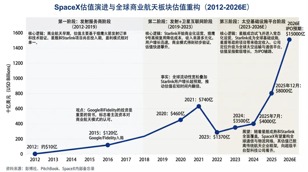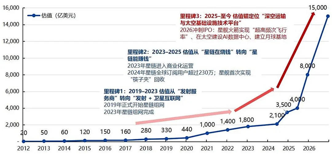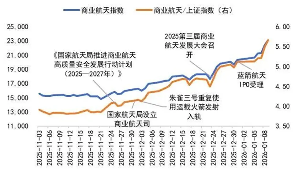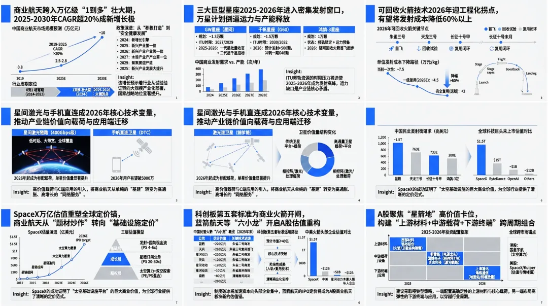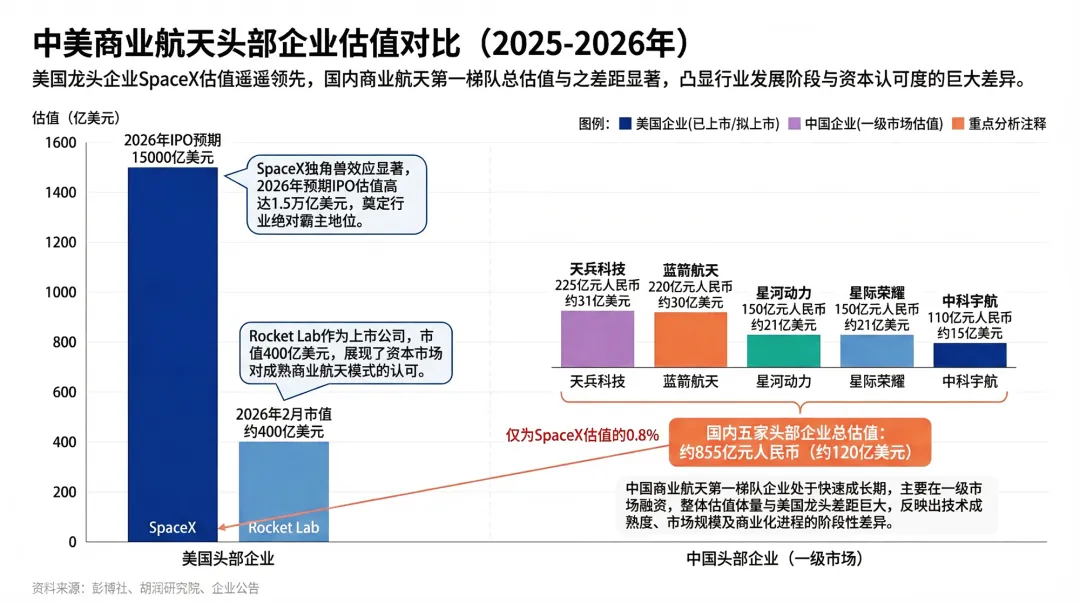 国家航天局发布《推进商业航天高质量安全发展行动计划(2025—2027年)》并新设“商业航天司”,明确到2027年基本实现商业航天高质量发展,形成从质量到资本的全面支撑体系(含全生命周期质量管控与终身追责)。(政策支持)科创板第五套标准扩容至商业火箭,蓝箭航天IPO获受理、中科宇航完成上市辅导验收,港股亦拟放宽航天企业IPO门槛,行业迎来因技术成熟度驱动的“首波上市潮”。(IPO制度破冰)2026年预计有10款中大型可回收液体火箭首飞或复飞,覆盖国内主流技术路线(液氧煤油/甲烷、陆上/海上回收、着陆腿/机械臂捕获等),技术拐点与业绩拐点共振。(行业催化)Space X打开估值空间,全球商业航天板块估值重构!(估值空间)美国龙头企业SpaceX估值遥遥领先,国内商业航天第一梯队总估值与之差距显著,凸显行业发展阶段与资本认可度的巨大差异。(国内头部企业估值带宽)