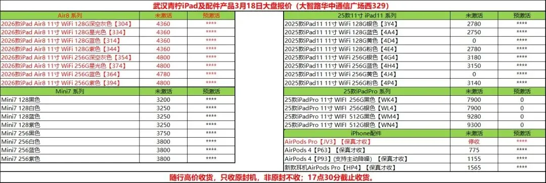 苹果手机平板到货邮寄武汉地址:湖北省武汉市江岸区大智路华中通信广场西329室W329