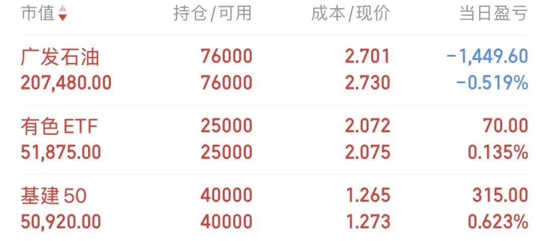 今日中证500指数上涨1%,ETF轮动账户下 跌-0.34%,亏损1060元。 今天买入有色ETF和基建50ETF、目前150%仓位。