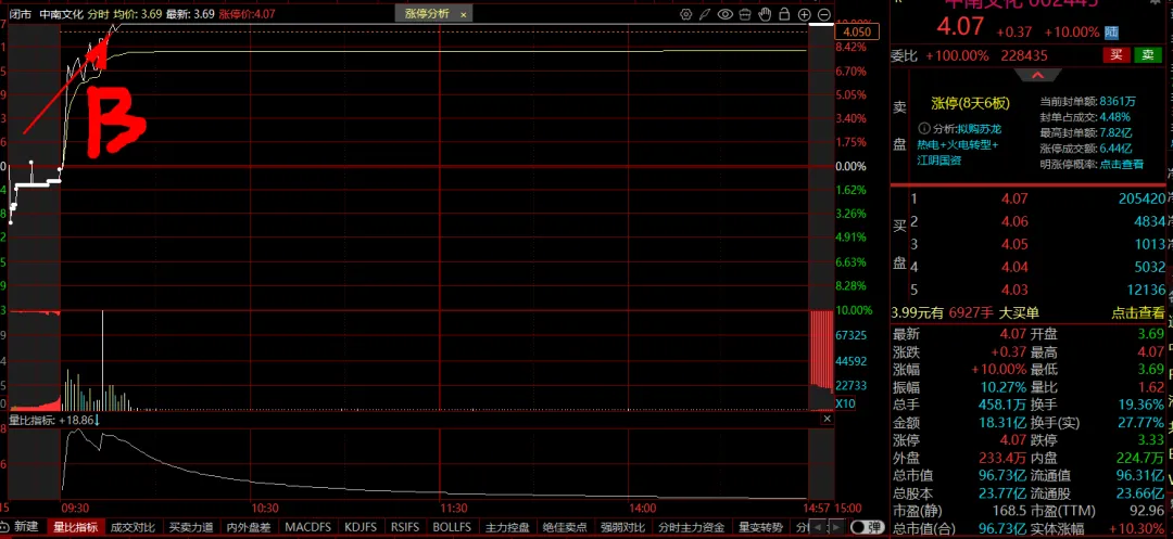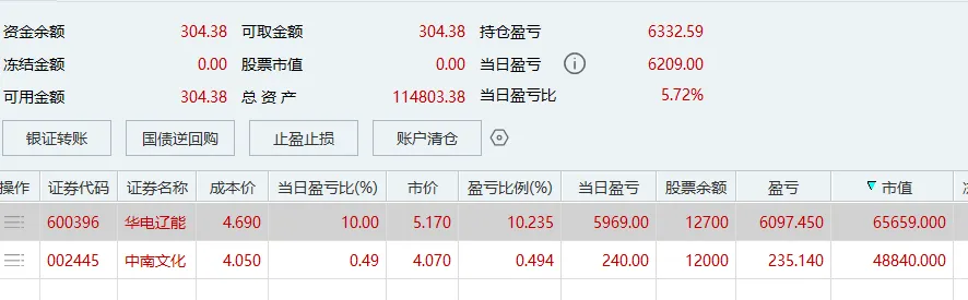1.学会止损是首要,当日亏损5%以上强制自己空仓;3.持续盈利后更应该保持冷静,这时候危险往往更容易到来;6.情绪冲动的时候不要追高,开盘后20分钟内最易冲动。昨天打板的二板补涨电力股,今天开盘竞价弱转强,开出一字,一字开盘没有卖出的道理。通过最近的打板经历来看,主升趋势下的反包板,次日往往会有溢价。究其原因,无非是前期涨停经过分歧后再次涨停,分歧转一致,买入往往能吃到肉。目前没有主流题材,热点往往持续2-3天后就开始出现分歧,随后经过2-3天的分歧后,股价回归均线,就又有资金开始拉板,循环往复。连板高度达到了5板,电力板块持续上榜,今天量化拉了电力、算力、航天几个板块。航天毕竟属于前期主流板块,但是上面套了较多的人,普涨肯定不适合,后面机会不好把握。电力板块近期持续性更好,电算协同,本月很多赚钱的操作都是买的电力。大盘今日缩量反弹,没有放量的反弹都是自欺欺人,如果明天继续缩量,那么就要空仓保命了。今日盈利0.62w,目前累计盈利1.48万,盈亏比例为+14.8%。华电辽能全天无操作,一字板没什么好说的。昨天还在担心减持影响今天走势,没想到开盘竞价就开始弱转强。所以有的时候运气真的说不准。早晨判断今天是反弹的一天,所以打板强势反包的中南文化。