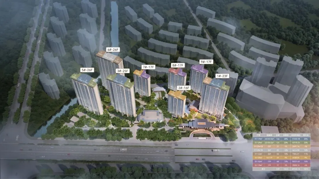 比如,容积率仅2.4,绿化率35%, 包含4栋16-17层小高层及4栋22-26层高层产品,全盘仅 500余席。