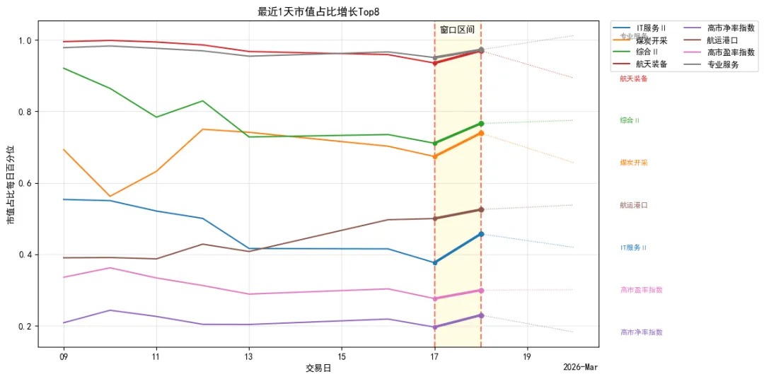 IT服务Ⅱ、煤炭开采、综合Ⅱ、航天装备Ⅱ、高市净率指数、航运港口、高市盈率指数、专业服务