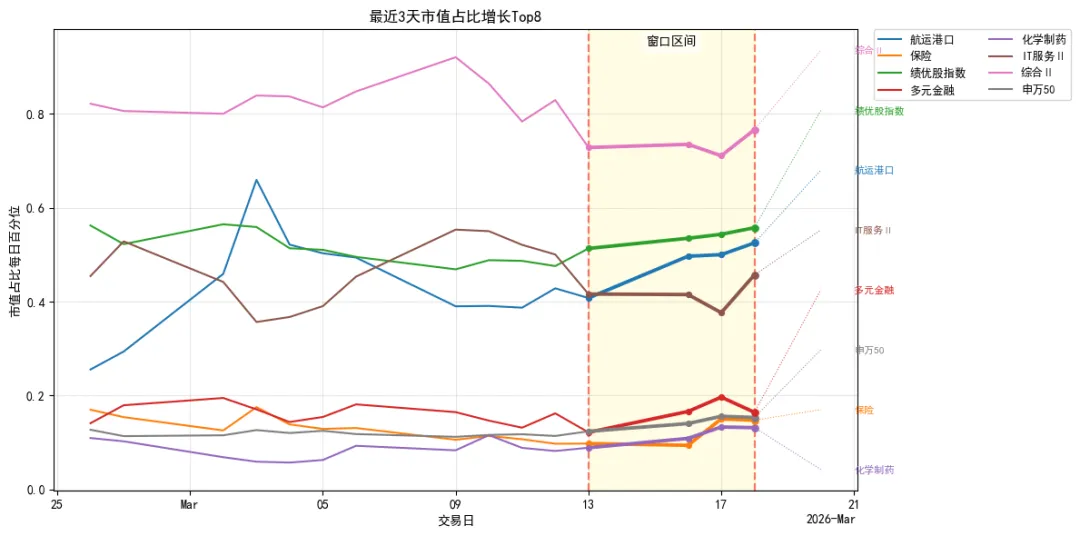 航运港口、保险Ⅱ、绩优股指数、多元金融、化学制药、IT服务Ⅱ、综合Ⅱ、申万50