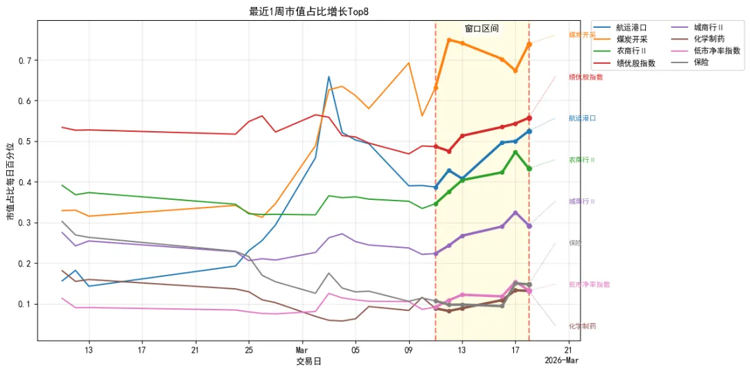 航运港口、煤炭开采、农商行Ⅱ、绩优股指数、城商行Ⅱ、化学制药、低市净率指数、保险Ⅱ