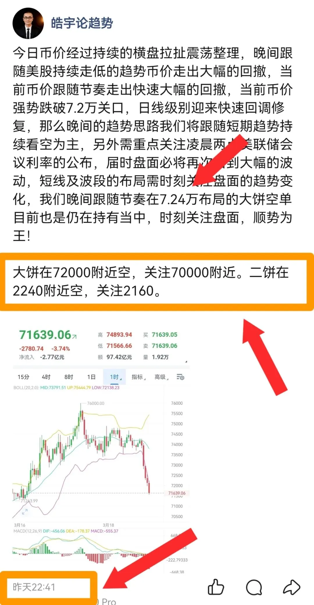 大饼在71400附近空,先看70000,破位继续下看68000。二饼在2180附近空,关注2120,破位继续下看2050附近。