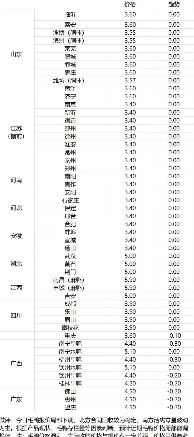 微评:鸭苗报价上涨。(注:南方只报当天价格)苗量少,计划紧张,养殖端成本高企,合同发放量控制。根据产品、养殖成本及鸭苗现状分析,预计近期鸭苗价格呈震荡偏强趋势。种蛋报价涨5分。温馨提示:该价格为主流厂家报价,实际销售价格以成交价格为准,价格仅供参考。