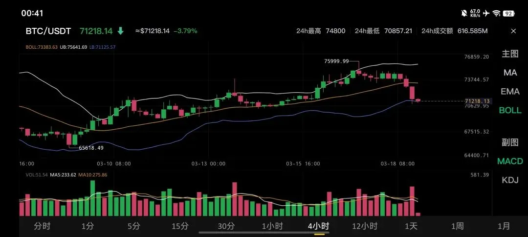 · 当前价格:71218.14 USDT,24小时跌幅 -3.79%。