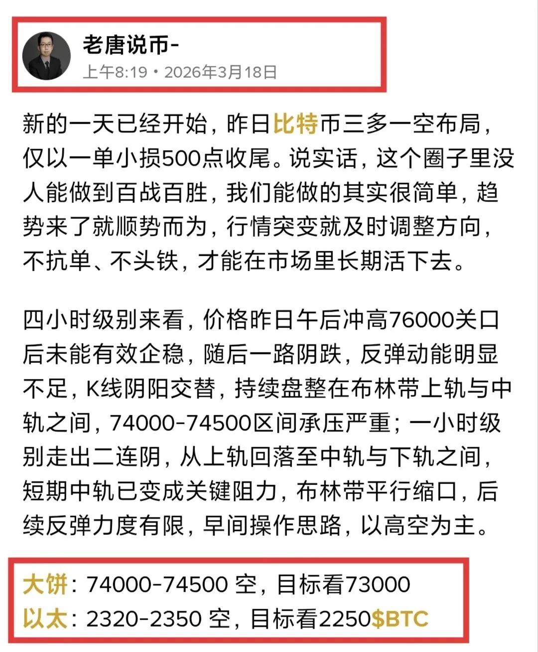 横盘磨心性,单边见功底,耐得住寂寞,才守得住繁华。日内行情从早上一直到下午都维持窄幅震荡,波动很小,很多人都被磨得没了耐心,结果到了晚间行情直接突变,迎来一波大幅下跌,单边跌幅超过3000点,完全印证了我们白天看空的思路。午间我们在74456位置布局的比特币空单,晚间在71731顺利止盈离场,一波直接拿下2725点的可观空间。