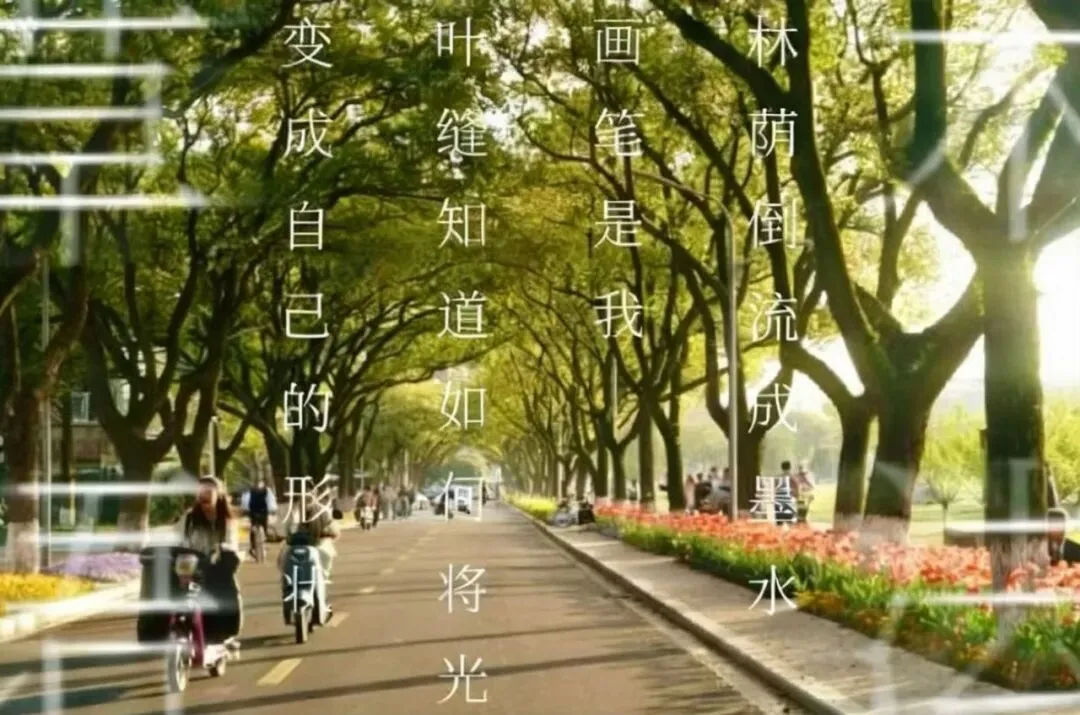 3、图片+文字的合成图,即以宁大校园一角的图片为背景,将三行情书的内容与图片合成最后的效果图