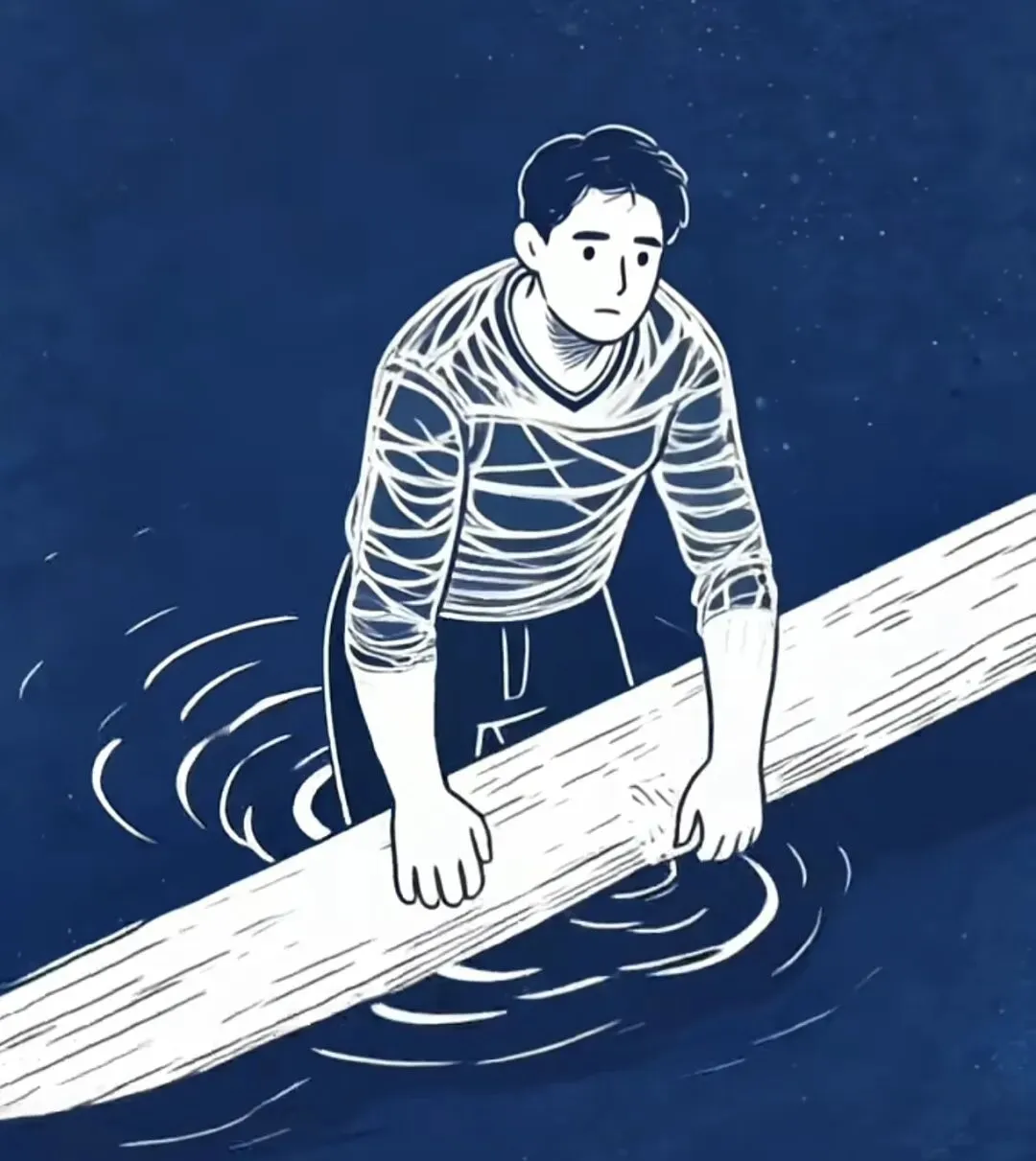 落水者爬上了岸,扔掉木板。