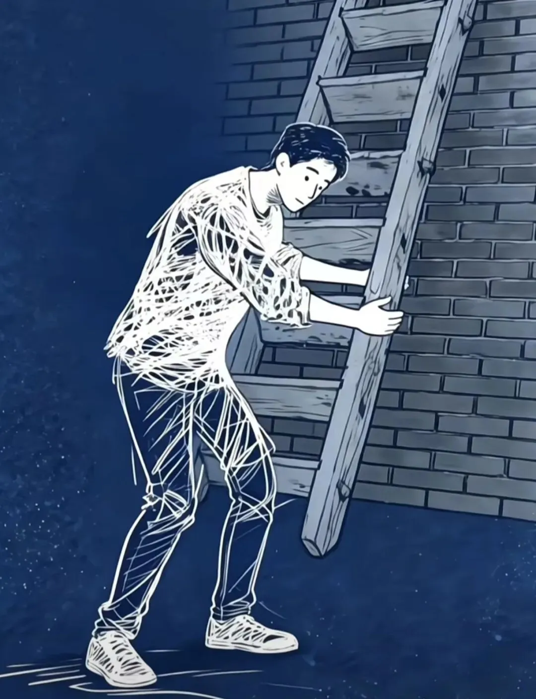 登高者翻过了墙,推倒梯子。