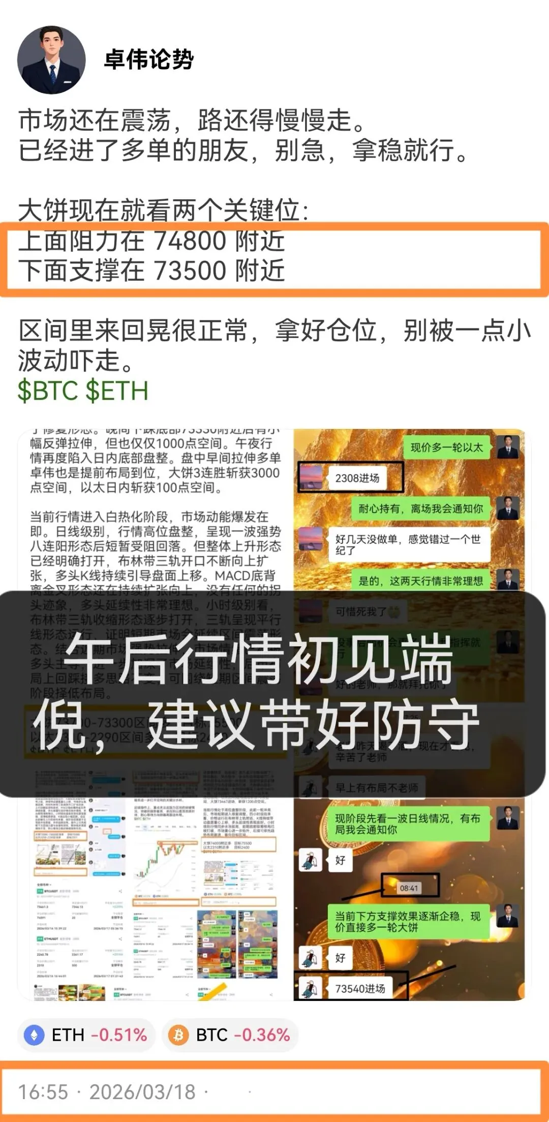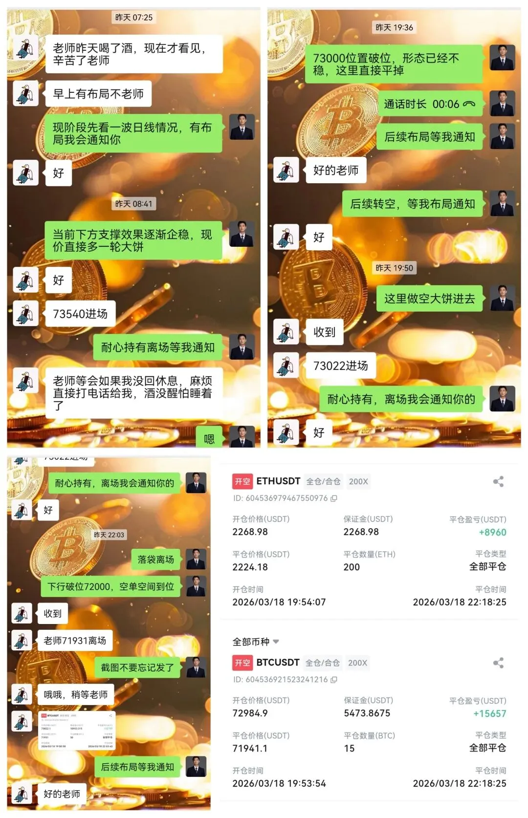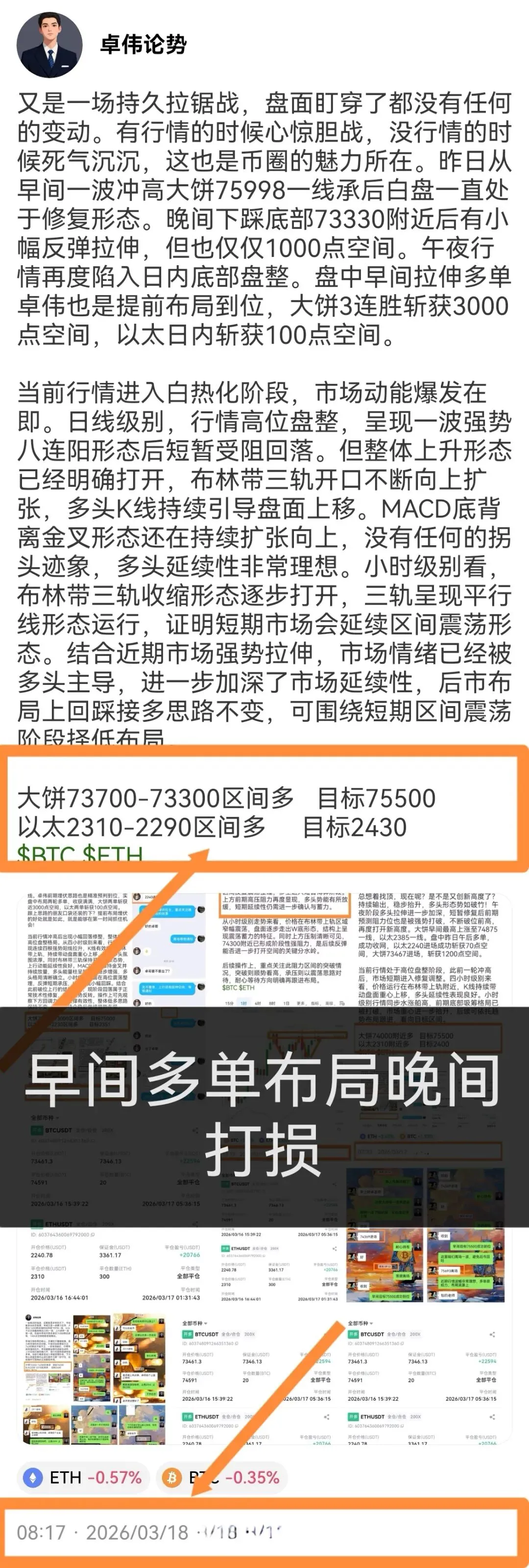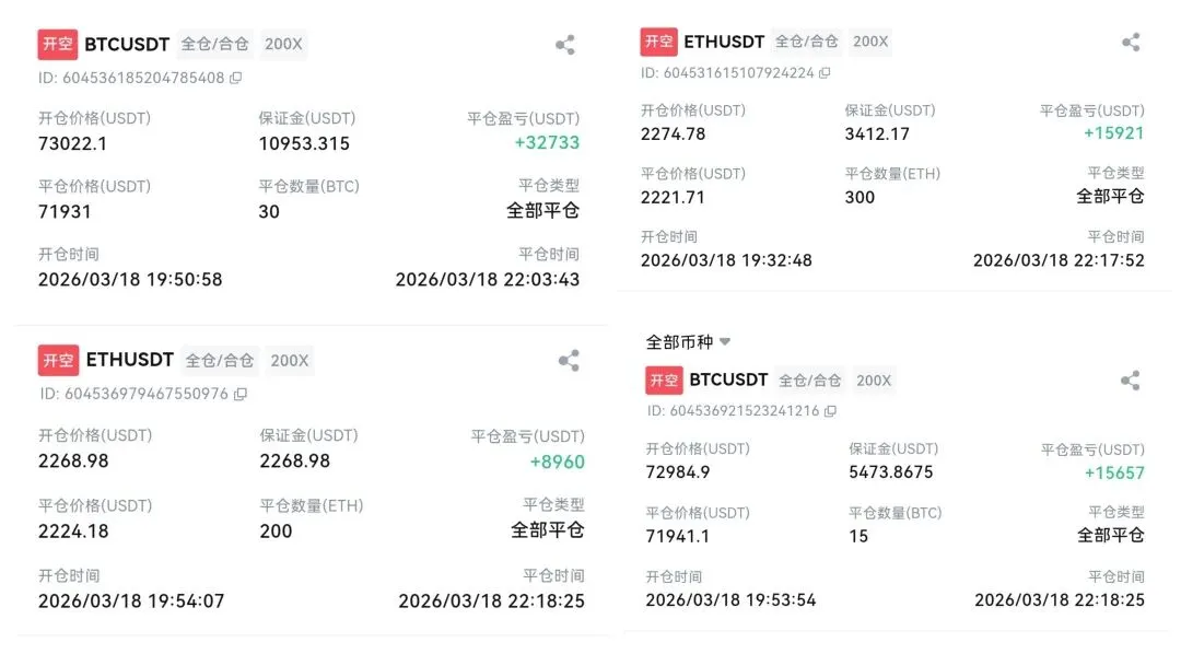 晚间及时挑头做空,大饼在73000附近布局两单,以太在2270附近布局两单,大饼最终斩获2134点空间,以太97点空间。