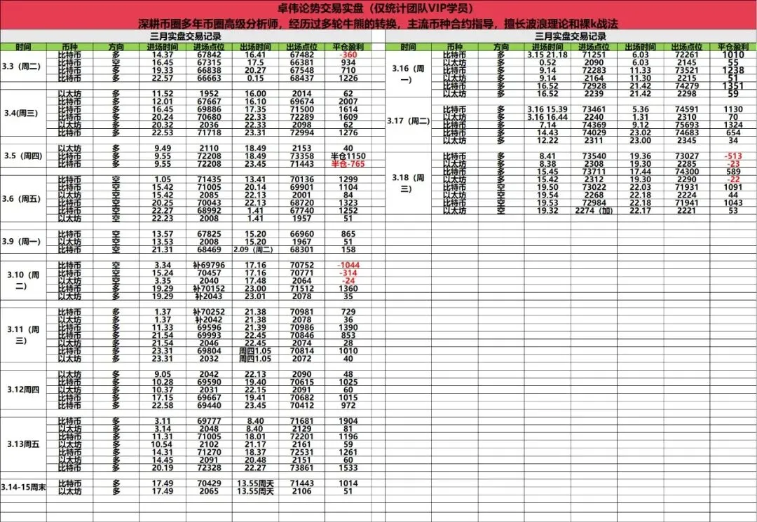 朋友们这个大门是不是有点措不及防?八连阳形态后的经典洗盘,这波回落确实是憋了很久啊!今日行情在白盘阶段都是持续区间震荡,高位不断盘整,晚间一波瀑布,把前两天的拉伸,一波吐出来了,大饼再度下探70800附近,以太同步下探2163一线。对于这波回落,卓伟还是有提前做准备,高位震荡期间一直强调的支撑位,晚上破位后,及时的提示大家转空,调整之后又是一波吃肉。跟上的朋友想必现阶段就是找底了吧?
