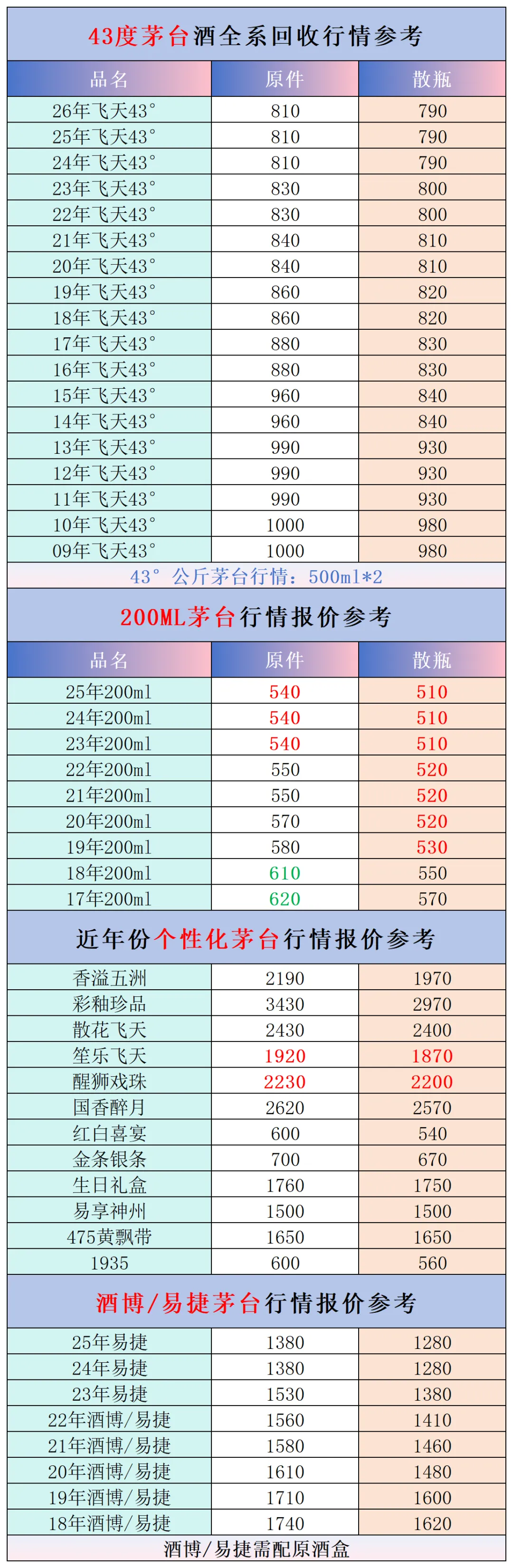 本公众号提供各种名酒回收行情报价,常规茅台、五粮液、洋河、剑南春、国缘等。所有报价根据市场买卖行情总结而来,每天更新最新报价!部分酒水每天涨跌幅较大,无法及时更新请谅解。本报价仅供参考,并非实际成交价格。感谢您的关注!我们会竭尽所能,提供更多更好的服务。