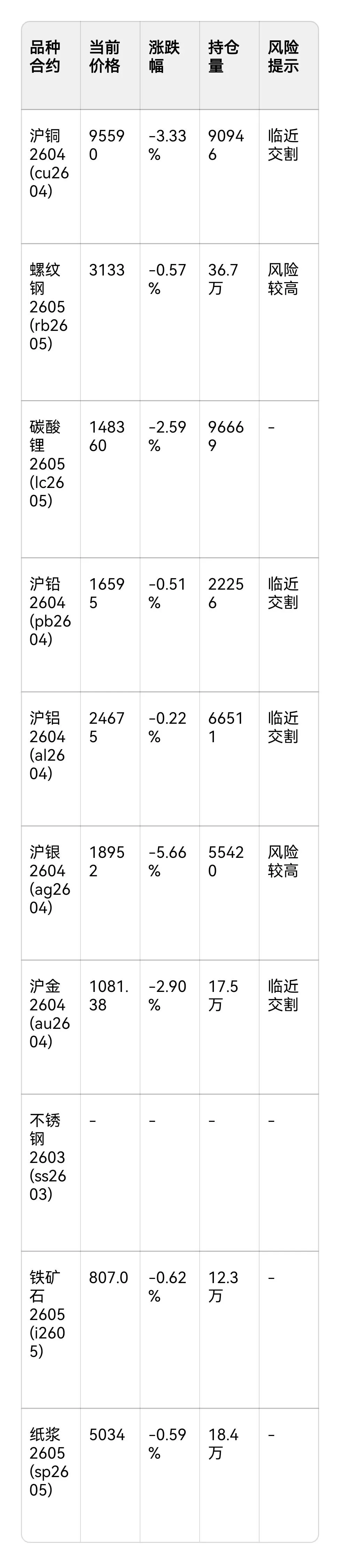 :沪铜、沪铅、沪铝、沪金合约均标注“临近交割”,个人投资者需注意规避交割风险,避免持仓进入交割月。