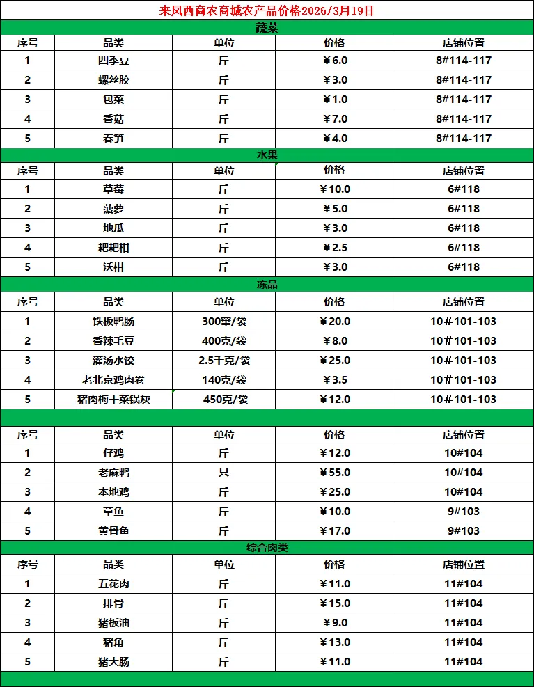 据农业农村部监测,3月18日“农产品批发价格200指数”为122.26,比前天下降0.17个点,“菜篮子”产品批发价格指数为123.88,比前天下降0.20个点。截至昨日14:00时,全国农产品批发市场猪肉平均价格为16.18元/公斤,比前天下降0.1%;牛肉66.15元/公斤,与前天持平;羊肉64.68元/公斤,比前天上升0.2%;鸡蛋7.55元/公斤,比前天上升0.4%;白条鸡17.29元/公斤,比前天上升0.5%。重点监测的28种蔬菜平均价格为4.88元/公斤,与前天持平;重点监测的6种水果平均价格为7.88元/公斤,比前天上升0.5%。鲫鱼19.85元/公斤,比前天下降0.1%;鲤鱼14.42元/公斤,比前天下降0.2%;白鲢鱼10.47元/公斤,比前天下降1.7%;大带鱼42.21元/公斤,比前天上升1.3%。 昨日,国内鲜活农产品批发市场重点监测的46个品种中,与前天相比价格升幅前五名的是莴笋、平菇、菠萝、葱头和洋白菜,幅度分别为3.0%、2.7%、2.4%、2.2%和1.7%;价格降幅前五名的是菠菜、白鲢鱼、西瓜、西葫芦和胡萝卜,幅度分别为1.9%、1.7%、1.6%、1.4%和1.4%。