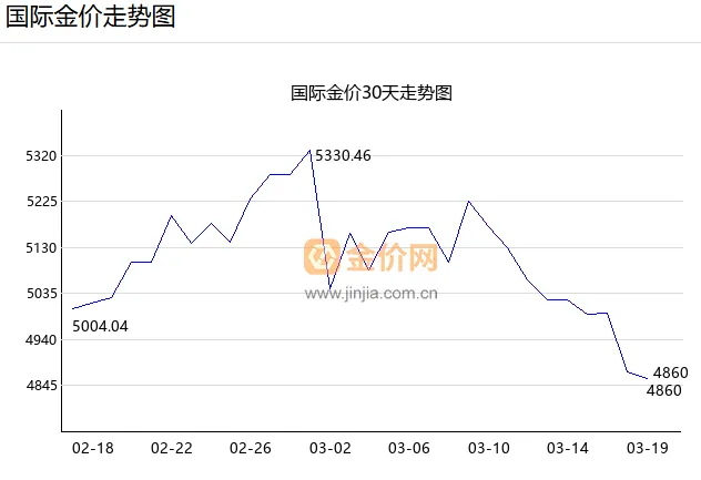 2026年3月19日黄金价格涨跌行情最新消息:油价狂飙,金价银价等贵金属价格大跳水,现货黄金一度跌逾3%,触及4834.62美元的低点,跌至一个多月来的最低水平。现货白银一度跌逾4%,创一个月来新低;布伦特原油一度突破107美元/桶。铂金和钯金价格同步下跌。美联储将基准利率维持在3.50%-3.75%不变,连续第二次按兵不动,符合市场预期。美联储维持2026年降息一次、2027年降息一次的预测。截至2时1分,现货黄金下跌2.31%至每盎司4889.2美元,现货白银下跌2.86%至每盎司76.99美元,现货铂金下跌2.77%至每盎司2063美元,现货钯金下跌4.82%至每盎司1526.1美元。黄金实时价格1081元,白银实时价格18.76元,铂金实时价格467.2元,钯金实时价格335.3元。 扫描上方二维码-查看实时金价行情!
