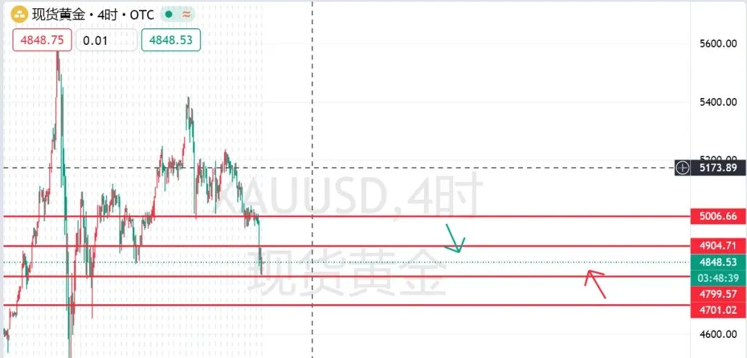 3、趋势判断:短期(1–2 日):低位震荡修复,核心区间4800–4900 美元,反弹以弱势修正为主,难改空头趋势。中期(1–3 周):若美元持续走强,金价或下探4700–4650 美元;若美元回落 + 地缘冲突升级,金价有望在4700–4900 美元区间震荡。
