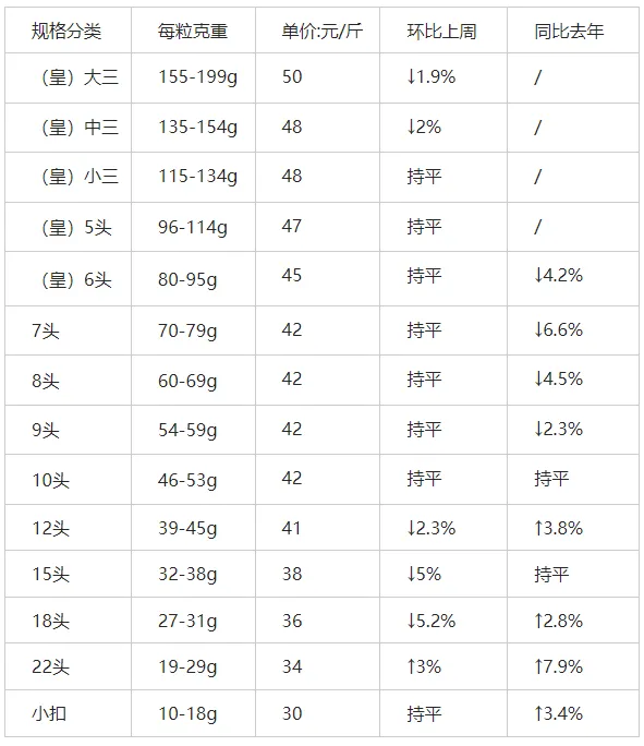 大鲍:波动收窄,进入平稳期。各规格价格波动已小于2%,其中(皇)小三、5头、6头价格与上周持平,显示市场已逐步消化节后波动,进入稳定阶段。