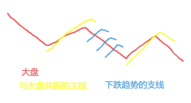 红色代表大盘,蓝色代表下跌趋势的支线,黄色代表主线。