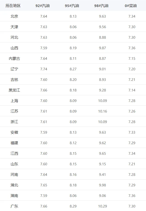 今日汽油油价通知: