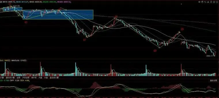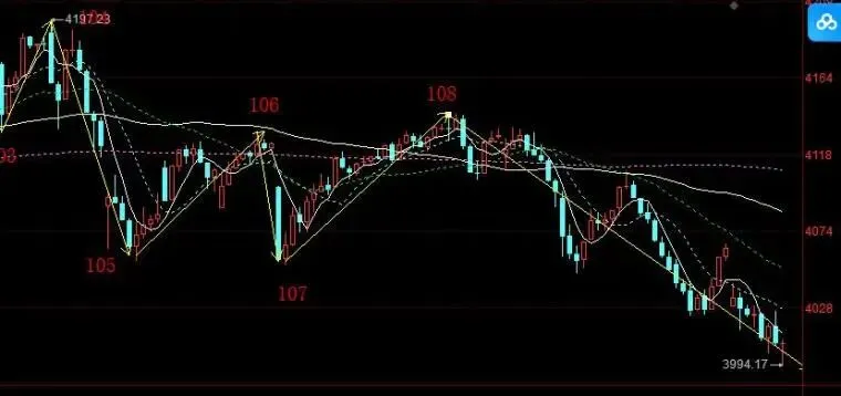 早盘直接下跌,5分钟第五笔下跌走势,尾盘跌破了4000点
