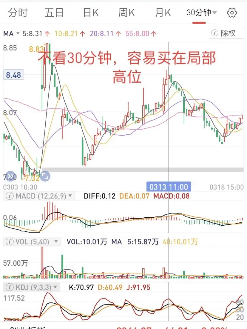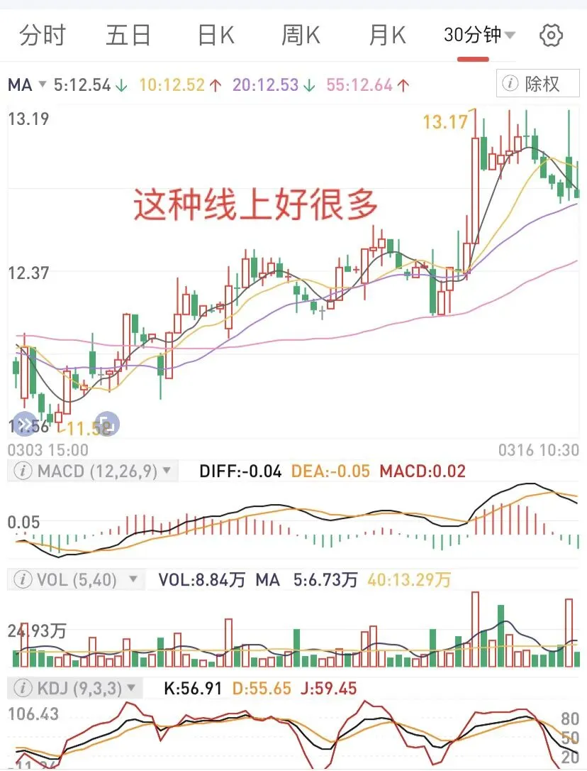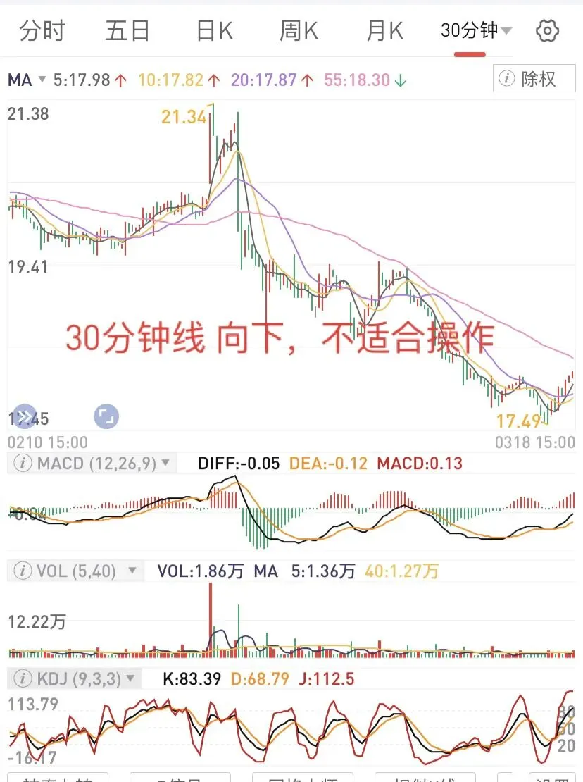一般趋势没有转变,操作难度是比较大的。30分钟线上,压制明显,机会还没出现,需要继续等待。当然可以看看周线,日线,一般30分钟可以是操作依据,没有转向前,操作很难。趋势没有转变之前,进入,就会出现这种需要等待的局面。有些票,可能比较快,但大环境不好的时候,这个趋势会延长,这时候,反思自己为啥加入呢?显然没有依靠30分钟线的趋势,这时候,也会发现30分钟的重要性。这里用几个图,主要还是30分钟上看,博反弹和长线持股,都需要考虑趋势,然后波段。因为离零轴还有点距离,只能继续观察,然后决定了,如果仓位不重,可以多等下,如果仓位重,在靠近零轴的时候,如果不能上去,可能还要下来,不妨先减仓。当然,也可以一直拿着,等着自己走回来,前提是,位置不要太高。这个经历了不久的水下后,很快上来了,是否能转过来,需要观察下,因为生命线还没向上,但有点意思,这个时候,可以重点关注。结合日线、周线是否可以操作。图形的信息比较清楚,但要想操作太难,因为30分钟比较敏感,需要结合日线、周线位置比较好。但至少,可以避免像上面的那样,接盘在高位。如果是轻仓,这个时候,补仓比较好。如果重仓,那就等下一次高位减仓,反复操作。这种图形相对很很多,结合日线、周线,大概知道参与。因为在水上,相对容易很多,但也会出现震荡和调整,并非一直向上。而这个可以作为一个波段来操作了,但这样的时间,往往不多,需要寻找和等待。再看这个,从水下上来后,可以持续一段时间,也是波段操作比较好,看30分钟线,结合周线和日线,可以决定是否继续。因为一旦上去,日线顶部,大概是另外一个高度,一旦下来,只能离开再说。有时候,反复波段,可能比一直拿着好很多,因为会过山车的。