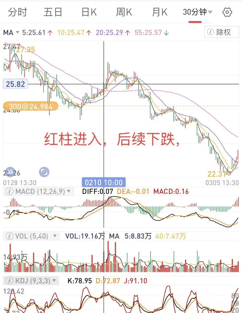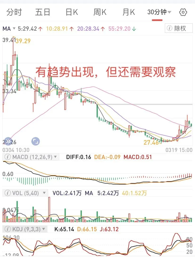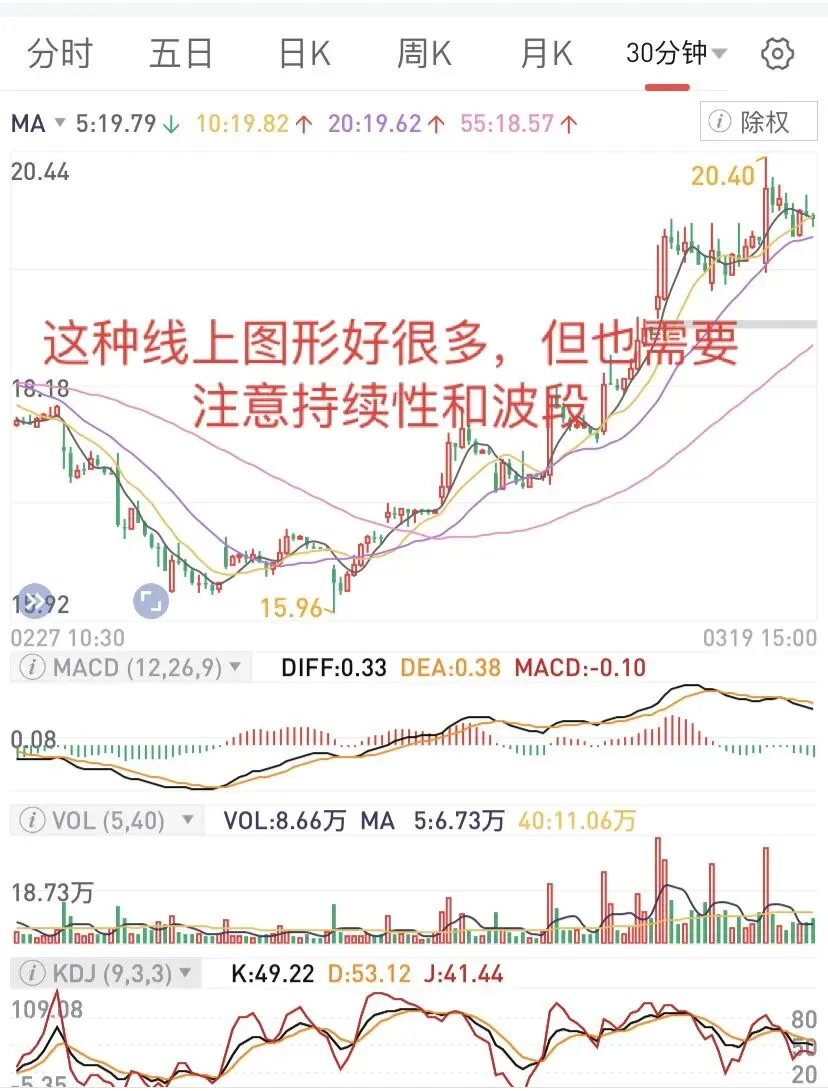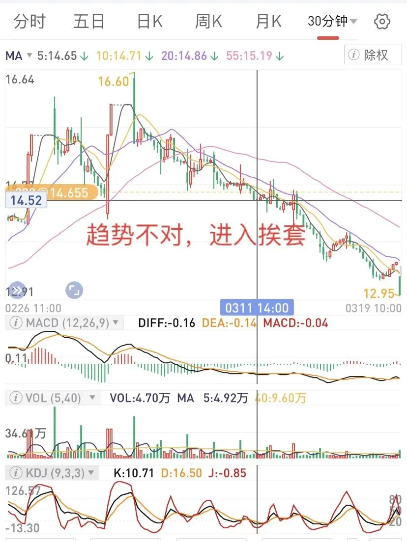 一般趋势没有转变,操作难度是比较大的。30分钟线上,压制明显,机会还没出现,需要继续等待。当然可以看看周线,日线,一般30分钟可以是操作依据,没有转向前,操作很难。趋势没有转变之前,进入,就会出现这种需要等待的局面。有些票,可能比较快,但大环境不好的时候,这个趋势会延长,这时候,反思自己为啥加入呢?显然没有依靠30分钟线的趋势,这时候,也会发现30分钟的重要性。这里用几个图,主要还是30分钟上看,博反弹和长线持股,都需要考虑趋势,然后波段。因为离零轴还有点距离,只能继续观察,然后决定了,如果仓位不重,可以多等下,如果仓位重,在靠近零轴的时候,如果不能上去,可能还要下来,不妨先减仓。当然,也可以一直拿着,等着自己走回来,前提是,位置不要太高。这个经历了不久的水下后,很快上来了,是否能转过来,需要观察下,因为生命线还没向上,但有点意思,这个时候,可以重点关注。结合日线、周线是否可以操作。图形的信息比较清楚,但要想操作太难,因为30分钟比较敏感,需要结合日线、周线位置比较好。但至少,可以避免像上面的那样,接盘在高位。如果是轻仓,这个时候,补仓比较好。如果重仓,那就等下一次高位减仓,反复操作。这种图形相对很很多,结合日线、周线,大概知道参与。因为在水上,相对容易很多,但也会出现震荡和调整,并非一直向上。而这个可以作为一个波段来操作了,但这样的时间,往往不多,需要寻找和等待。再看这个,从水下上来后,可以持续一段时间,也是波段操作比较好,看30分钟线,结合周线和日线,可以决定是否继续。因为一旦上去,日线顶部,大概是另外一个高度,一旦下来,只能离开再说。有时候,反复波段,可能比一直拿着好很多,因为会过山车的。