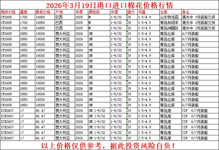 据顺风棉花网sfmianhua.com棉花大数据中心最新监测显示,3月19日港口最新进口棉花价格行情。长期追踪棉花市场价格变动,欢迎关注我们。 顺风棉花网始创于2005年8月,是国内最早从事棉花信息咨询服务的专业平台之一。二十年来,我们始终致力于为产业链企业提供涵盖籽棉、皮棉、进口棉及棉花期货的全方位信息咨询服务,已成为业内信赖的专业信息机构。依托深厚的行业数据积淀与持续的研究,我们为棉纺企业提供精准、及时的《美棉每日报告》与《郑棉每日报告》,助力企业进行基差点价、期货套保、场外期权及生产经营决策,有效应对市场波动。