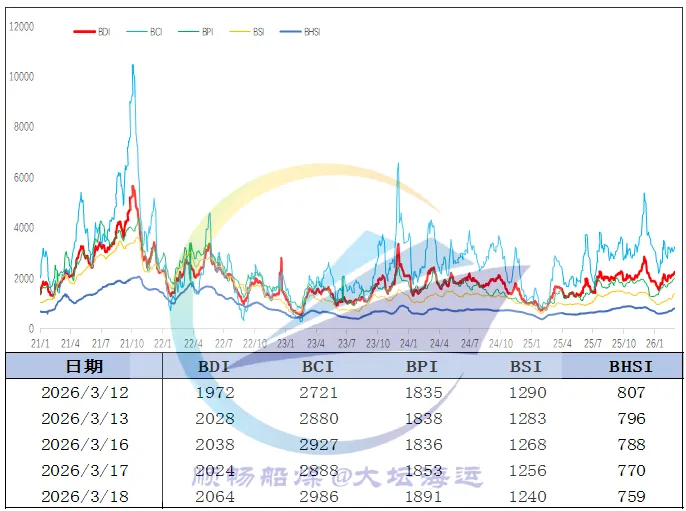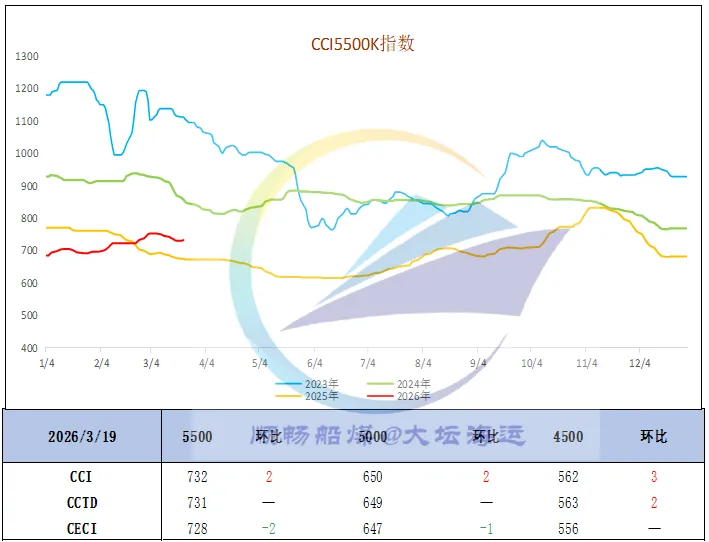 当前中东局势持续升级,沙特、卡塔尔油气设施接连遭袭,国际油价再度大幅走高,进一步推升船舶运营成本。鉴于冲突短期难见缓和,油价仍存在进一步上涨可能,成本端支撑持续强化,对当前及后市运价均构成有力支撑。与此同时,国际煤价居高不下,国内终端对进口煤接受度偏低,进口煤招标量显著回落,电厂多转向采购内贸低卡煤以弥补进口缺口;加上大秦线春季检修临近、终端提前备货,以及秦皇岛港库存高位、疏港需求提升,沿海市场订船热度持续向好,运价在高位继续上行。