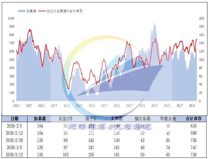 近日,产地煤炭供应保持充足,叠加铁路部门在春季集中修前全力增运上量,货源到港及建库积极性提升,大秦线日运量维持满发水平,港口调入量居高不下。而沿海电厂库存整体处于合理区间,补库压力不大,北上拉运需求有限;加上恶劣天气导致港口偶发封航,船舶装卸作业受限,调出量提升乏力,整体不及调入量,港口库存持续攀升。