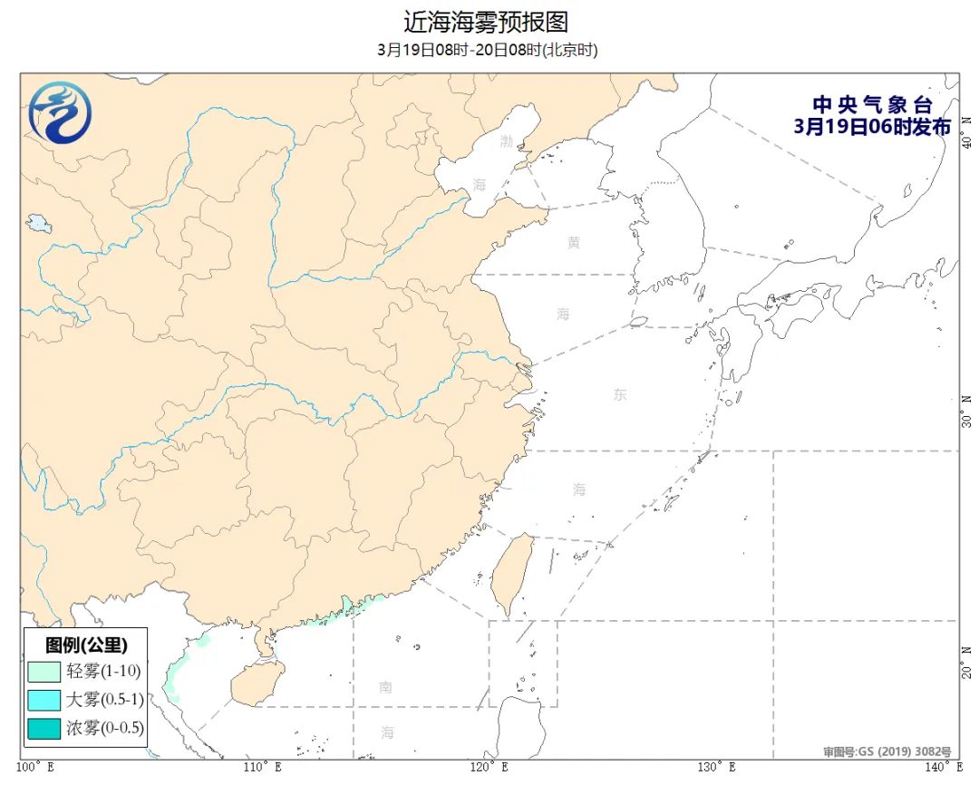 19日08时至20日08时,东海南部海域、台湾海峡、台湾以东洋面将有5~6级、阵风7级的东北风。广东中部沿岸海域,北部湾西部海域将有轻雾。