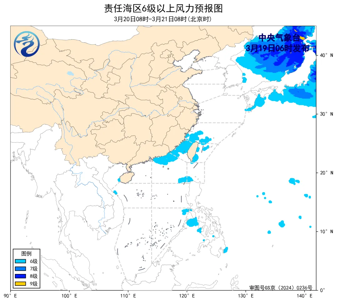20日08时至21日08时,台湾海峡将有5~6级、阵风7级的东北风。