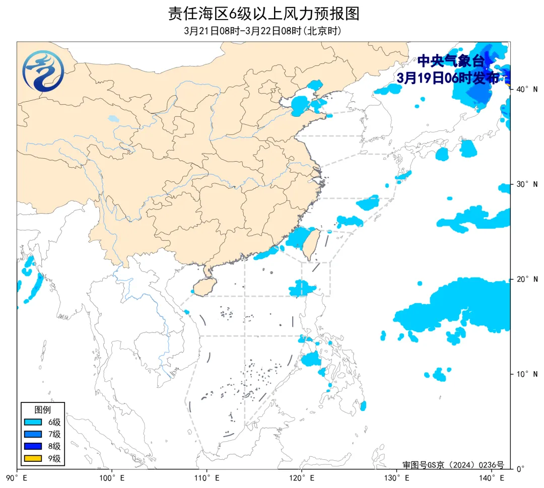 21日08时至22日08时,渤海、渤海海峡将有5~6级、阵风7级的偏南风,台湾海峡将有5~6级、阵风7级的东北风。