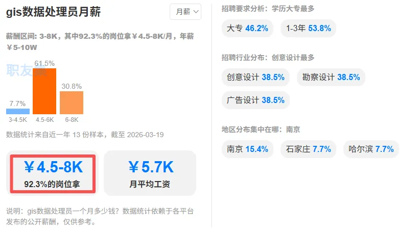 某平台数据显示,gis数据处理岗,92.3%的从业者仅拿到4.5-8K的月薪;且在企业眼里,本科与专科学历在此类岗位上几乎没有差别;