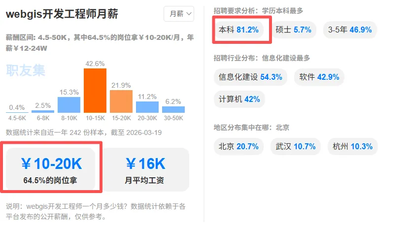 而WebGIS开发岗,64.5%的从业者可以拿到平均月薪10-20K,且招聘要求以本科学历为主。