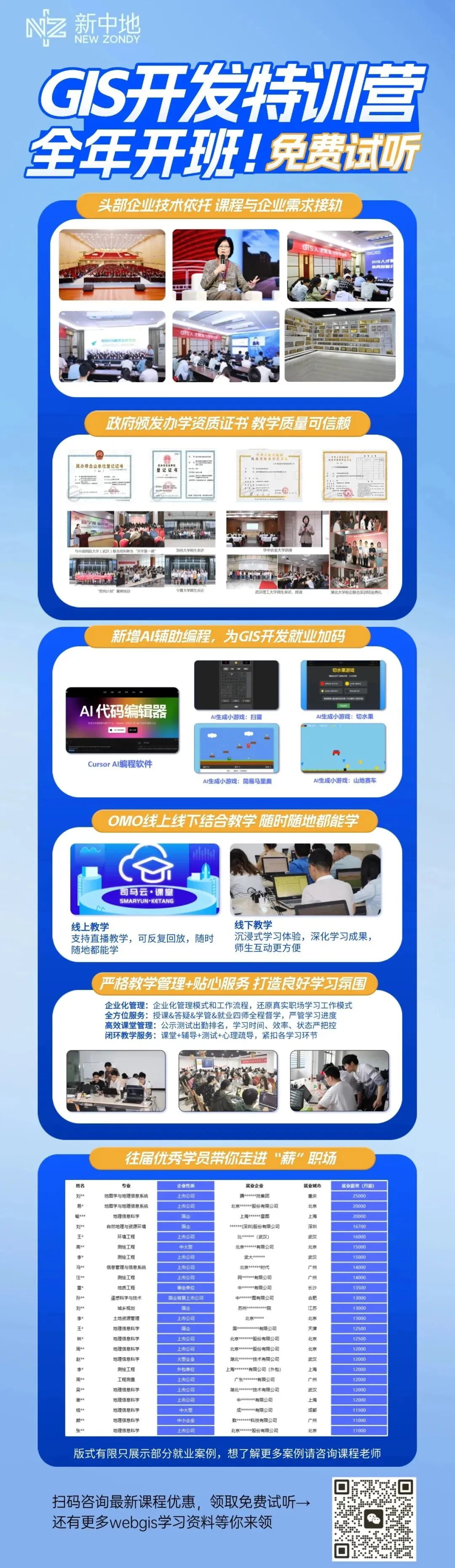 不想考研、复试失利,或是不愿耗三年光阴读研的同学,不用再盲目内耗——新中地GIS开发特训营就是专为地信人量身打造的技能突围之路,依托中地数码行业资源,深耕WebGIS/三维GIS开发实战培训,完美衔接地信专业背景,精准对接企业高薪岗位需求。
