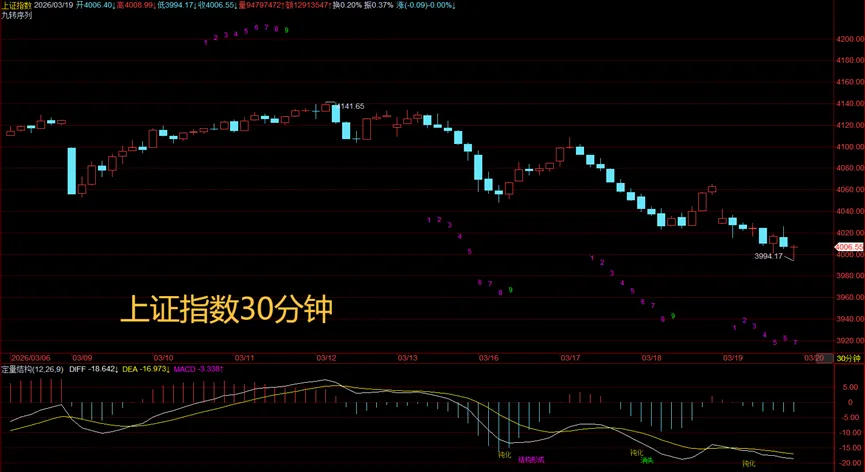 今天指数继续下行,我在昨天还强调,60分钟以上的钝化已经消失,说明还处在一个下跌的鼎盛过程,今天虽然还有一个30分钟的钝化存在,但也岌岌可危,很容易消失,一旦所有钝化消失,短期内不会有较大级别的底部结构了;只有耐心等待市场出现降速后,才会再次出现底部信号,不过随着时间推移,距离出现低点的时间也会越来越近,近期大家依然保持耐心,静待市场给我们信号!