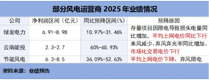 2025年,绿发电力、云南能投、节能风电等风电运营企业净利润预计同比下滑可达30%以上。