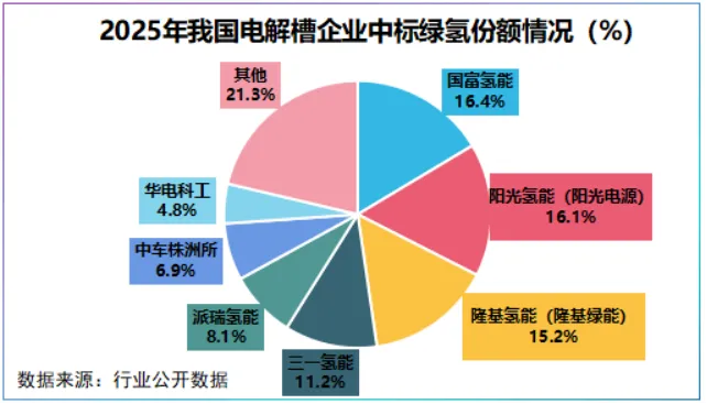 从我国2025年电解槽中标额看,国富氢能(港)、阳光电源和隆基绿能稳居前三,市占率分别为16.4%、16.1%和15.2%,三者合计约占半壁江山。