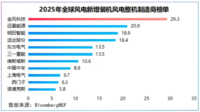 2025年,金风科技新增装机29.3GW,同比增幅达51.81%,继续保持全球第一大风机制造商的地位,远景能源以20.9GW位居全球第二,明阳智能紧随其后。