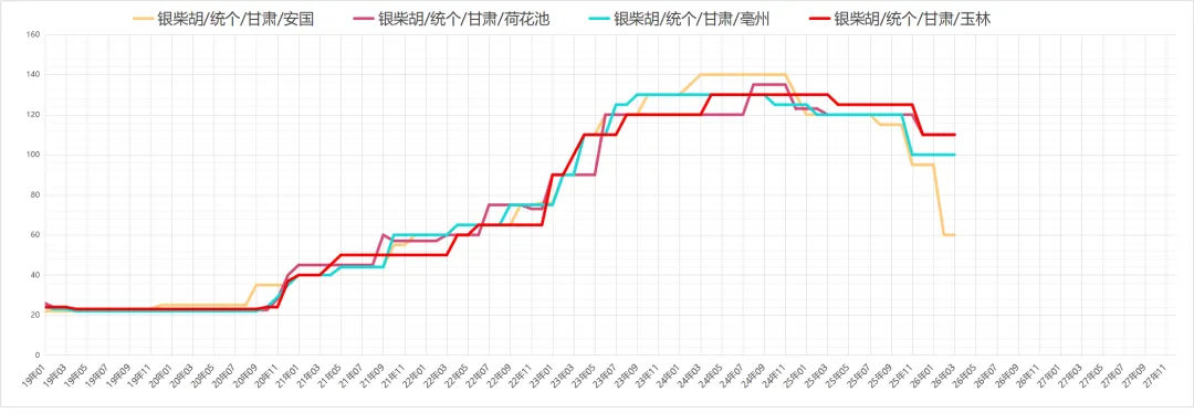 银柴胡产地剩余库存不多,近期商家采购积极性较高,货源走动较为顺畅,行情呈上行趋势,现统货售价60-70元。